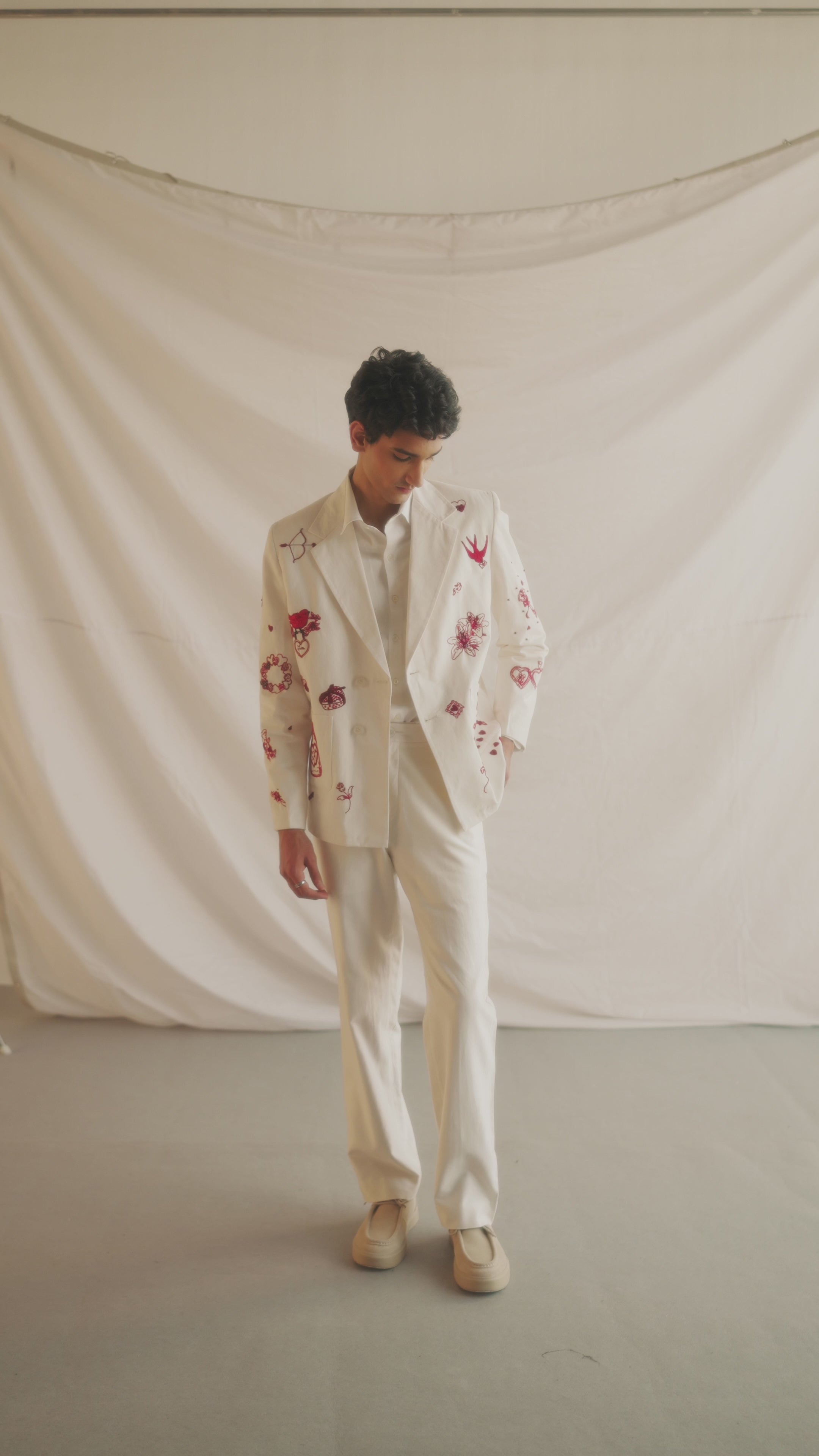 Rendered in soft ivory and brought to life with intricate scarlet embroidery, each motif draws inspiration from timeless symbols of love—hearts, arrows, and blooming florals. Hand-embroidered by master artisans, the blazer blends expressive storytelling with a refined silhouette. Ideal for soirées and statement moments alike.