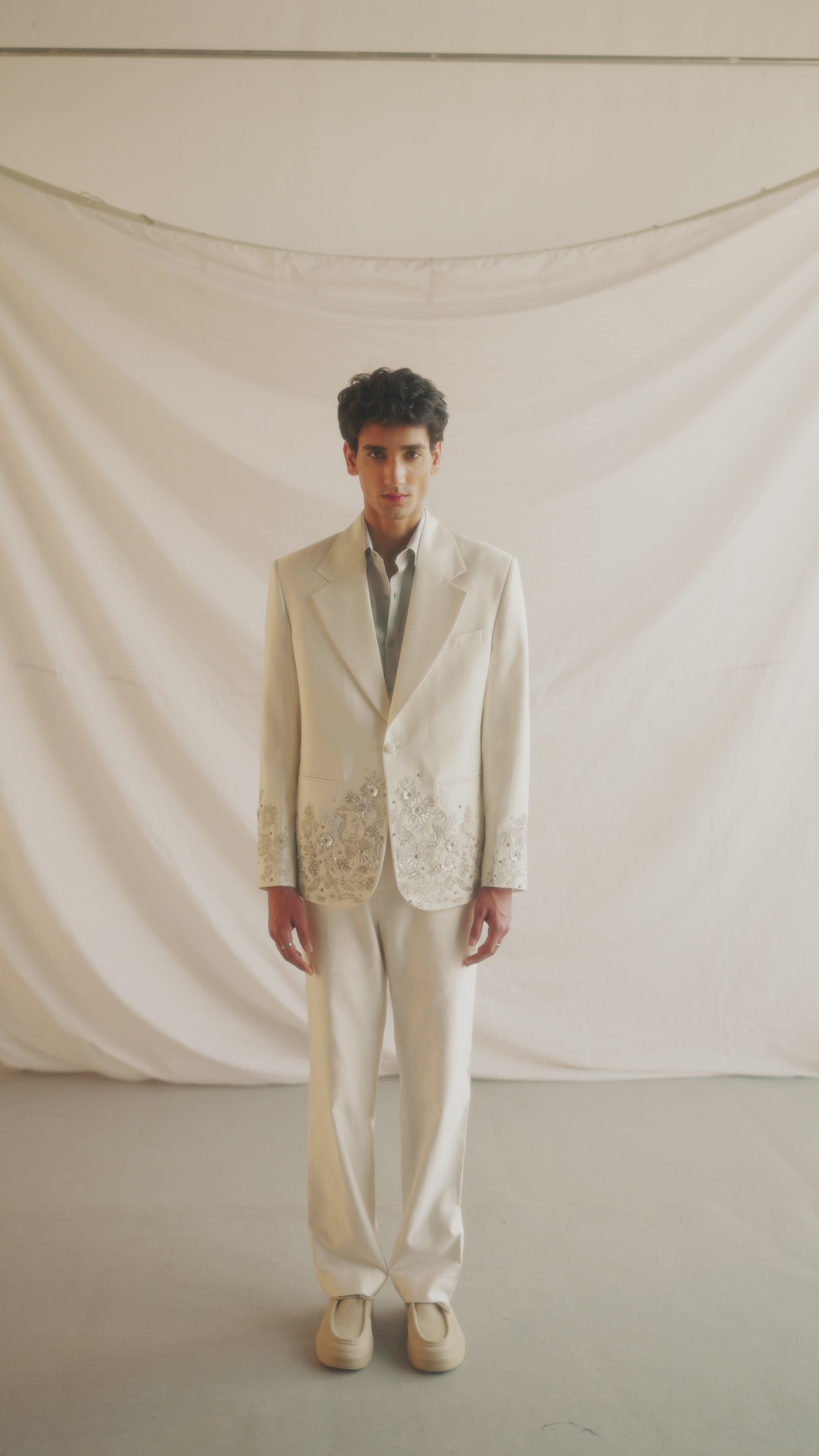 Featuring a classic wide peak lapel, a single-button front, and an elongated silhouette, the blazer transitions effortlessly from day weddings to moonlit soirées. The hand embroidery blooms across the sleeves and hemline, echoing nature’s quiet opulence through floral motifs and subtle shimmer.